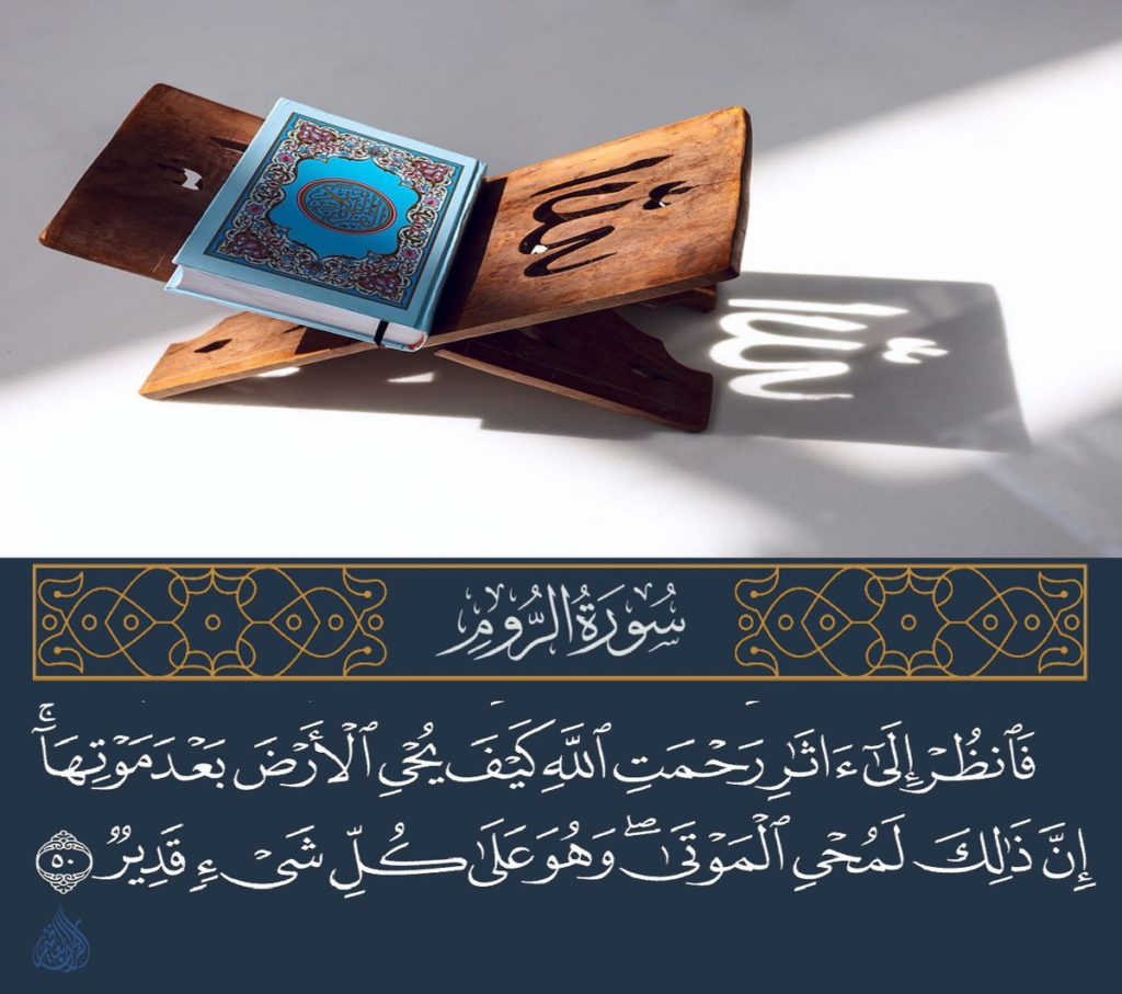 ﴿فَٱنظُرۡ إِلَىٰۤ ءَاثَـٰرِ رَحۡمَتِ ٱللَّهِ كَیۡفَ یُحۡیِ ٱلۡأَرۡضَ بَعۡدَ مَوۡتِهَاۤ إِنَّ ذَ لِكَ لَمُحۡیِ ٱلۡمَوۡتَىٰۖ وَهُوَ عَلَىٰ كُلِّ شَیۡءࣲ قَدِیرࣱ﴾[9].