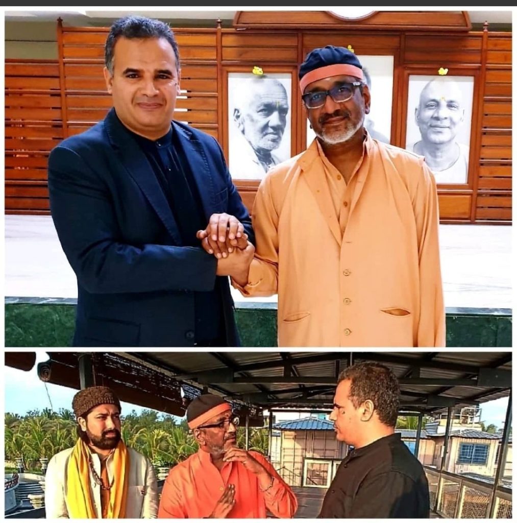 Above text in Arabic, English and French مع صديقي العزيز المعلم الكبير سوامي ميتراناندا.معلم كبير في اليوغا والتأمل.مئات الآلاف من الطلاب حول الهند.الآلاف من...