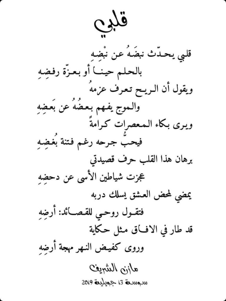 #ضحكة_القمر يَا ضِحْكَةَ القَمَرِ الحَيِيِّ وَحُمْرَةَ الخَدِّ النَّدِيِّ وَنَظْرَةَ الظَّبْيِ الرَّؤُومِ اغْتَالَ مِنْ طَرْفٍ خَفِيِّ وَمِشْيَةَ الجَذِلِ الطَّرُوبِ وَفِتْنَةَ اللَّدُنِ الطَّرِيِّ وَلُمْعَةَ الجَسَدِ النَّضِيرِ