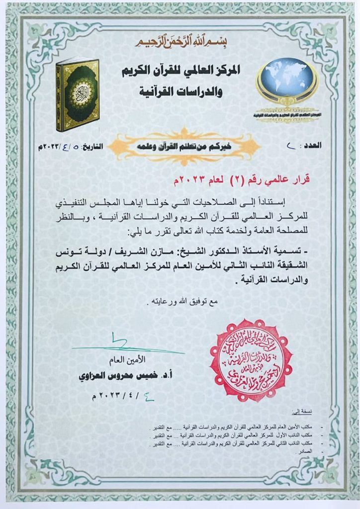 في ليلة السر والسرور بمولد سبط النبي ونجل الزهراء وعلي سيدنا وجدنا الإمام الحسن عليه السلام، تأتي البشائر من رحاب القرآن العظيم، ويشرفني فضيلة الشيخ الدكتور خميس محروس العزاوي الأمين العام للمركز العالمي للقرآن الكريم والدراسات القرآنية، بأن أكون نائبه الثاني.