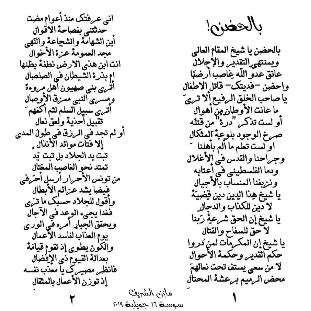 الْقُدْسُ نادت فَلبـَّى الكونُ: يا قُدْسُ وردَّدَ الْبدْرُ والأفْلاكُ والشَّمْسُ فالْقُدْسُ أُمْنيةٌ والأرْضُ تعشقُهَا والْقُدْسُ أغْنِيةٌ يشدُو بِهَا الأَمْسُ والْقُدْسُ عالِيةٌ فالأنبيَاءُ بهَا تيجَانُ